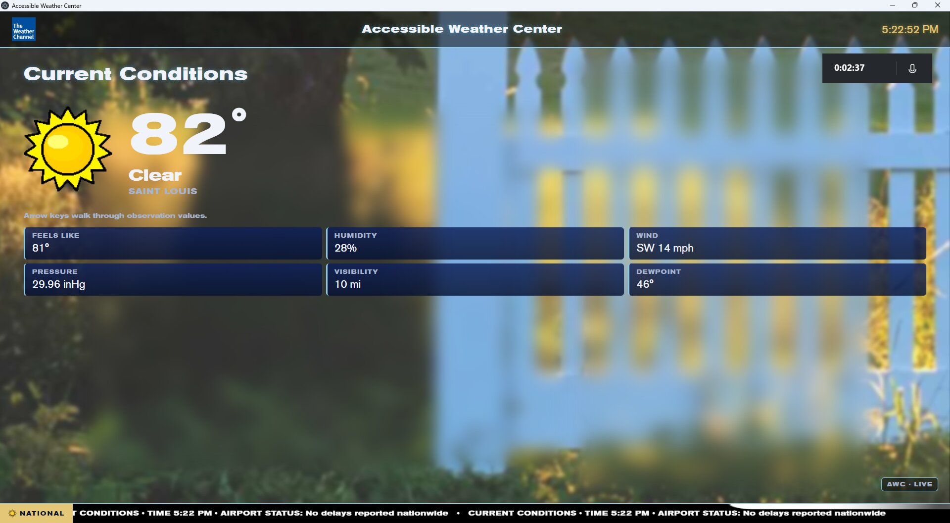 A speech- and keyboard-driven weather application with a Weatherscan-style cycling display. Every visual — including radar, normally inaccessible to screen readers — is mirrored by a semantic narration, so blind and low-vision users get life-safety weather information at the same fidelity as sighted viewers, as data and not pixels.