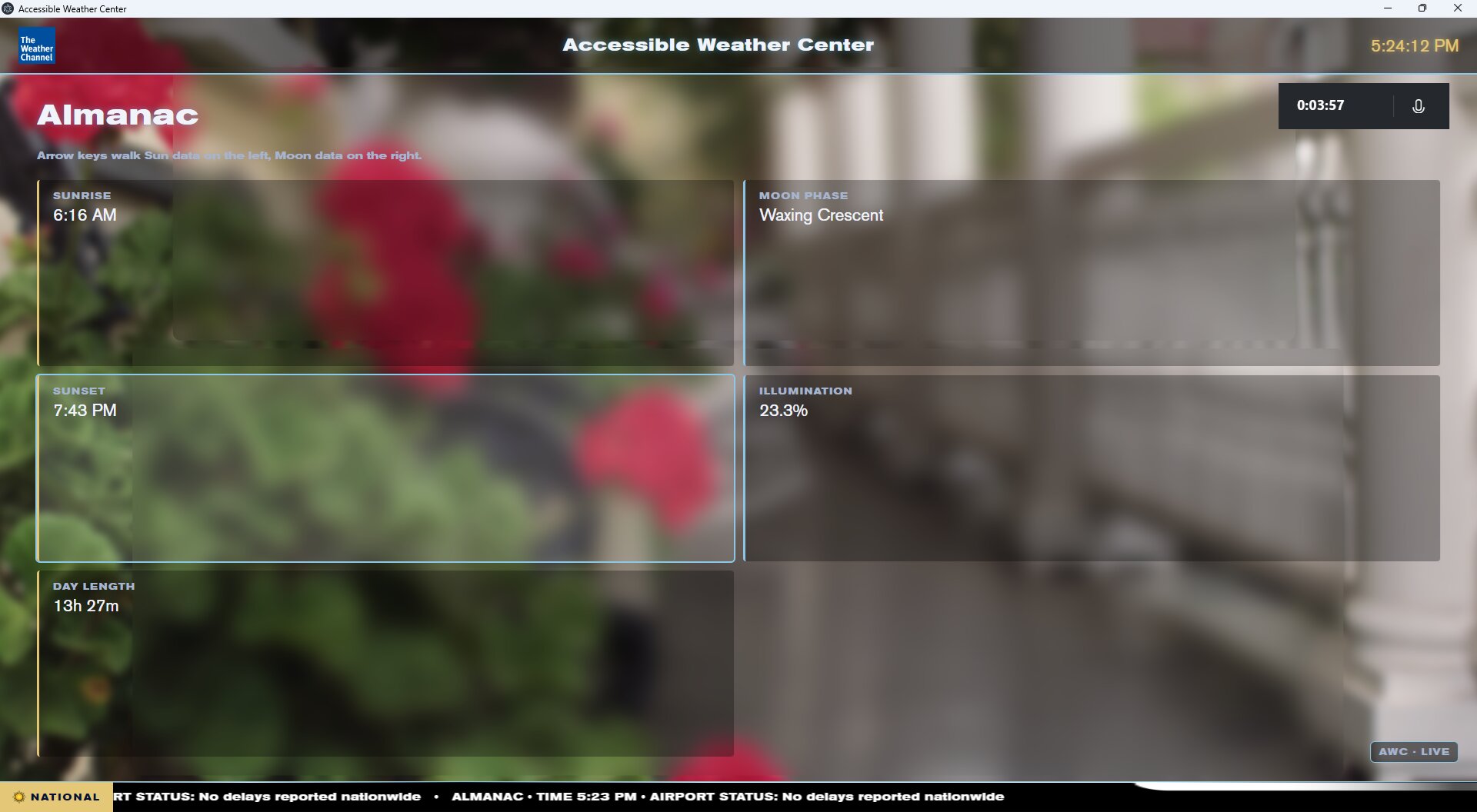 A speech- and keyboard-driven weather application with a Weatherscan-style cycling display. Every visual — including radar, normally inaccessible to screen readers — is mirrored by a semantic narration, so blind and low-vision users get life-safety weather information at the same fidelity as sighted viewers, as data and not pixels.